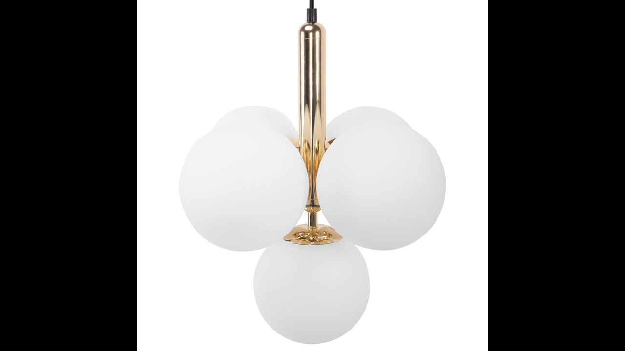 Elegancka i nowoczesna lampa sufitowa, która doda wyjątkowego stylu każdemu wnętrzu. Lampa jest wyposażona w pięć szklanych kloszy o subtelnym, mlecznym kolorze, zamocowanych na złotej podstawie, co sprawia, że doskonale pasuje do nowoczesnych, minimalistycznych aranżacji. Klosze emitują delikatne, rozproszone światło, które tworzy przyjemną atmosferę i równomiernie oświetla pomieszczenie. Złota podstawa wykonana z metalu oraz wytrzymałe szklane klosze zapewniają trwałość i długotrwałe użytkowanie.