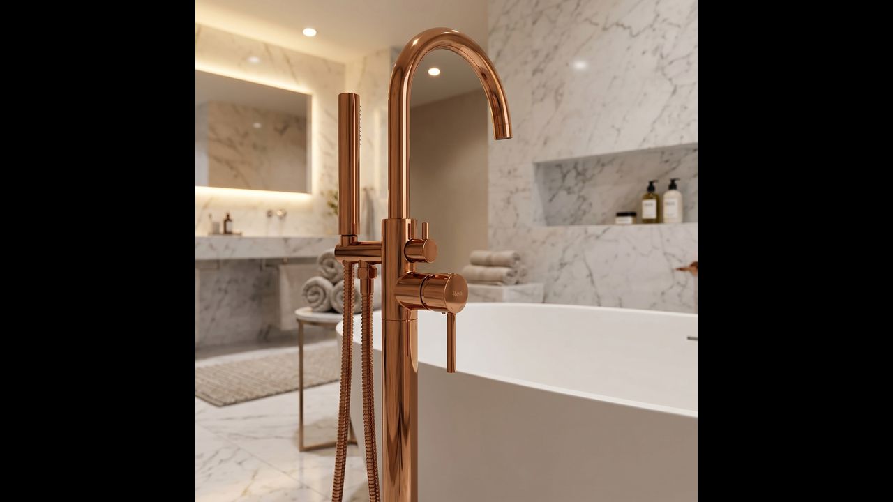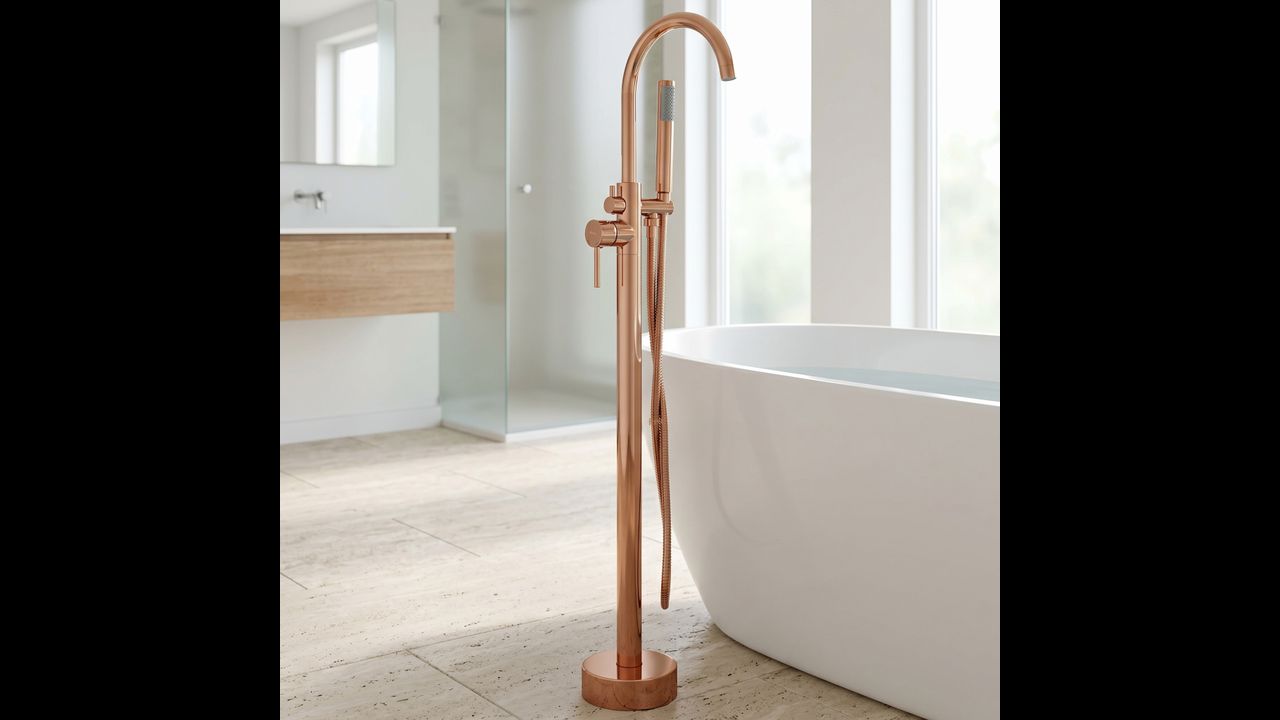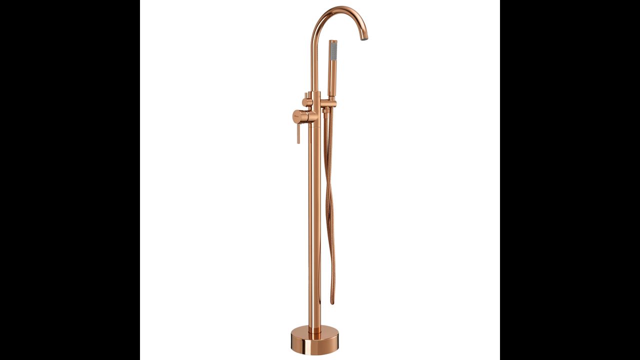 Напольный смеситель для ванны Lungo в магнетическом медном цвете (Copper) — это квинтэссенция роскоши и современного дизайна. Его стройный высокий силуэт в сочетании с теплым блеском меди придает любой отдельно стоящей ванне престижный вид.