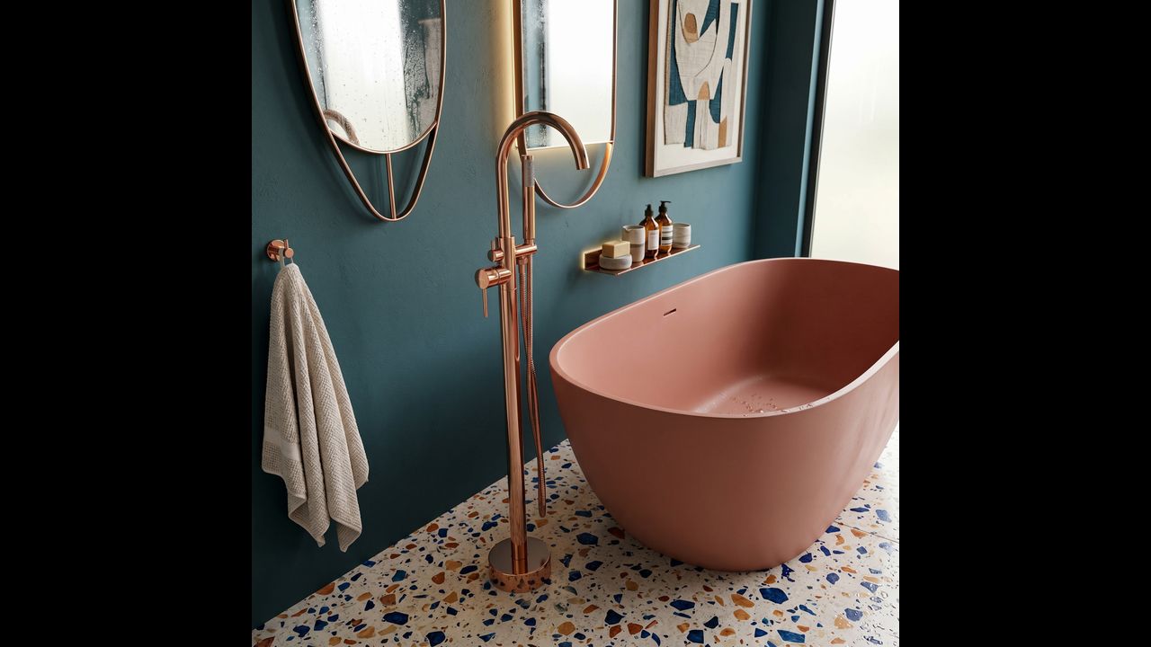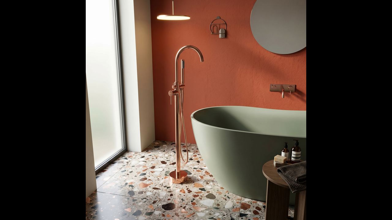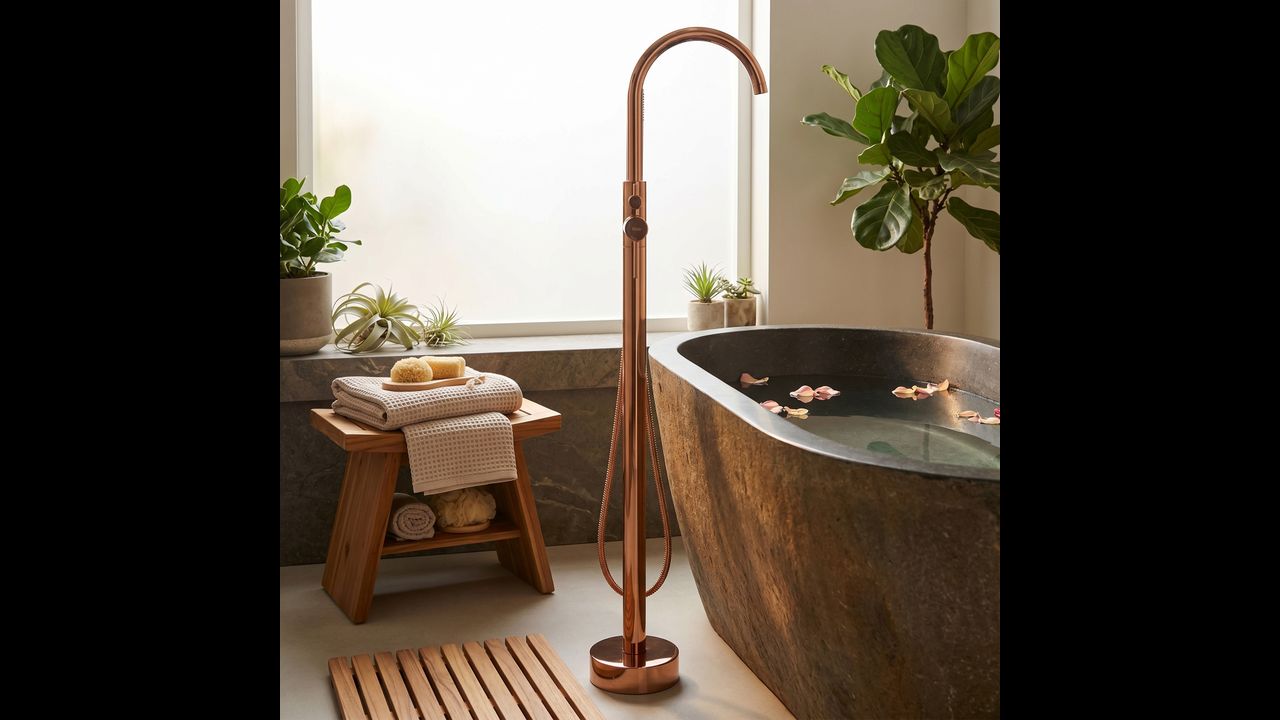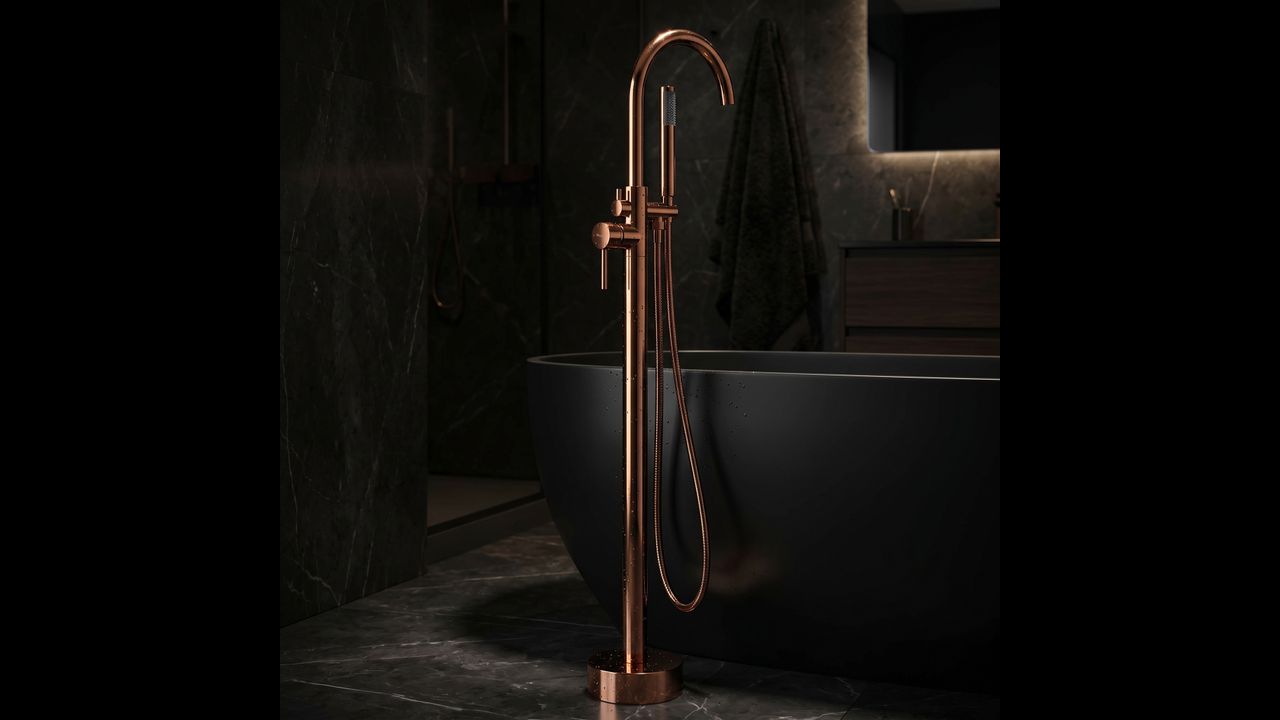 Напольный смеситель для ванны Lungo в магнетическом медном цвете (Copper) — это квинтэссенция роскоши и современного дизайна. Его стройный высокий силуэт в сочетании с теплым блеском меди придает любой отдельно стоящей ванне престижный вид.
